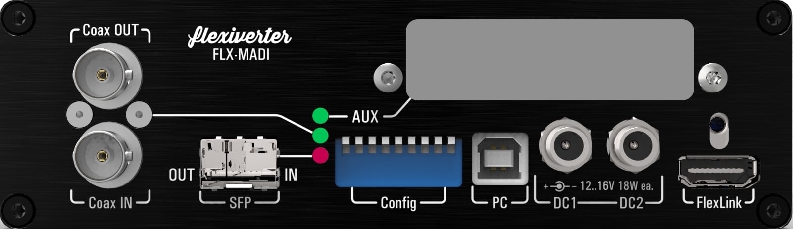 FLX-MADIはコンパクトなMADI-to-Anythingコンバーターです。1つのMADI SFPと1つのMADI同軸ポートを備えています。このユニットは、内蔵ポート間の変換に使用することも、AUXスロットにインストールされた任意のプロトコルへの変換に使用することもできます。大規模なシステムでは、内蔵チャンネルに加え、AUXカードが提供するすべてをFlexLinkポートでも利用できるため、Multiverterや別のFlexiveterへの拡張として使用することも可能です。
